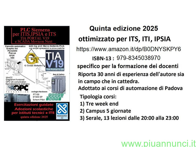 corso Corso Simens programmazioen con TIA PORTAL V21, nuova edizione Corsi di programmazione dei PLC Siemens, aperti per tutto il periodo delle vacanze di Dicembre e gennai, in varie modalità, sia in presenza, con vitto e alloggio che online a sessioni minime di 2 ore con attestato se raggiungono cumulative 20 ore, (costo online 15 ? all'ora). Si raccolgono adesioni e prenotazioni. I libri di testo, teoria e pratica, sono visibili nelle immagini. Padova (PD)