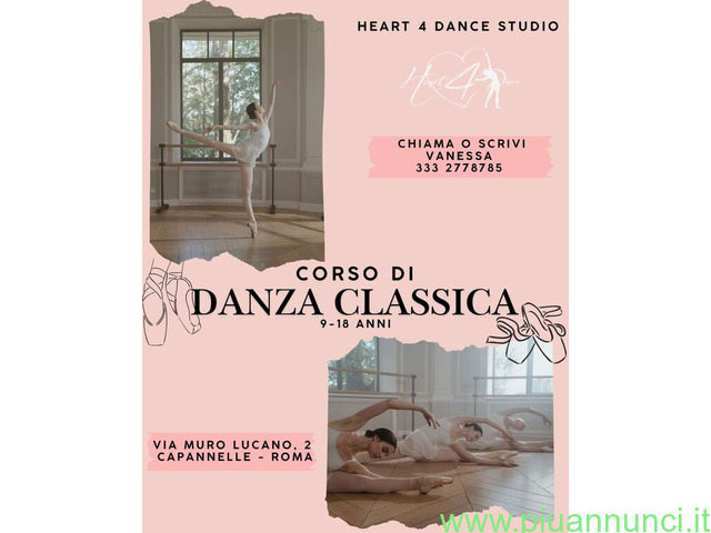 corso Corso di Danza Classica 9-18 anni Disciplina, grazia e passione si incontrano in un percorso che forma corpo, mente e cuore La danza classica è la base di ogni stile: sviluppa postura, forza, coordinazione e musicalità, aiutando ogni allieva e allievo a esprimersi con eleganza e consapevolezza. Un corso pensato per chi: Vuole perfezionare la tecnica e la presenza scenica Ama la bellezza e la precisione del movimento Desidera crescere in un ambiente professionale ma sereno Ogni lezione è un momento di scoperta, disciplina e armonia. Un passo dopo l?altro, si costruisce non solo la tecnica? ma anche la fiducia in sé stessi Heart 4 Dance Studio ? Via Muro Lucano 2, Roma Capannelle Info e iscrizioni: Vanessa [NUM] Iscrizioni aperte! Prenota ora la tua lezione di prova gratuita e inizia a danzare con il cuore! Roma (RM)