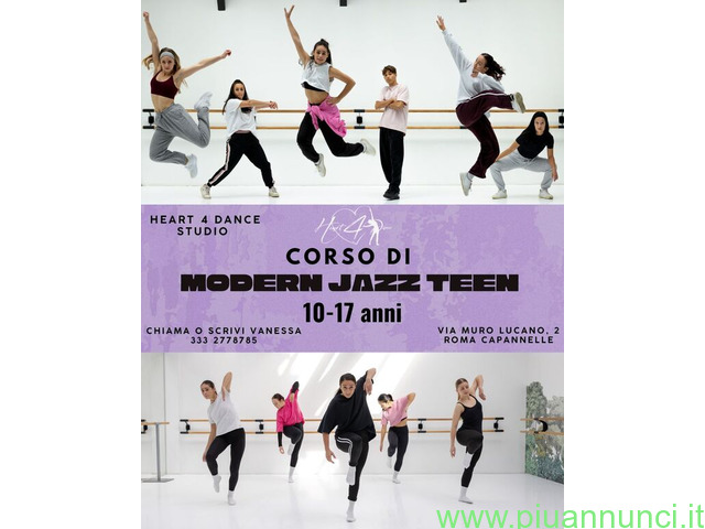corso Corso di MODERN JAZZ TEEN Modern Jazz Teen ? Heart 4 Dance Studio Energia, ritmo e libertà di espressione! Il Modern Jazz è la fusione perfetta tra tecnica, potenza e stile, ideale per i ragazzi che vogliono migliorare coordinazione, forza, musicalità e presenza scenica. Un corso pensato per i teen che amano la danza e vogliono crescere in un ambiente stimolante e positivo. Attraverso coreografie dinamiche e coinvolgenti, ogni lezione diventa un?esperienza di crescita artistica e personale Obiettivi del corso: Potenziare la tecnica e la flessibilità Sviluppare ritmo, energia e interpretazione Imparare a danzare con grinta e consapevolezza Heart 4 Dance Studio ? Via Muro Lucano 2, Roma Capannelle Info e iscrizioni: Vanessa [NUM] Dai spazio alla tua energia? e brilla sul palco! Roma (RM)