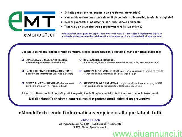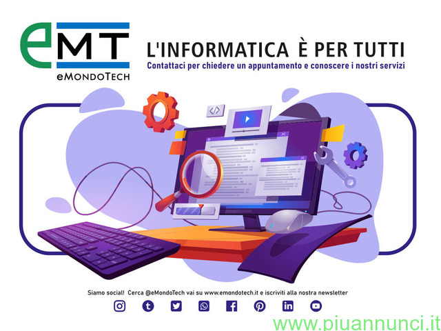 aiuto per lezioni di Ripetizioni d'informatica retribuzione oraria € 10 aiuto per lezioni di Ripetizioni d'informatica retribuzione oraria € 10 Ripetizioni di informatica dalla A alla Z (ANCHE ONLINE) corso Ripetizioni di informatica dalla A alla Z (ANCHE ONLINE) Ripetizioni di informatica dalla A alla Z (ANCHE ONLINE) Ciao, sono Fabio di eMondoTech e sono qui per offrirti ripetizioni di informatica dalla A alla Z. Hai difficoltà coi PC? Il tuo browser internet fa i capricci? Non ti preoccupare, col mio aiuto imparerai le basi per utilizzare il computer al top! Lavoro a Rovigo, Ferrara, Padova e zone limitrofe. La tariffa oraria è di € 10, 00 con pagamento anticipato (in particolare per paesi lontani a causa delle spese di carburante e autostrada). Arqua' Polesine (RO)